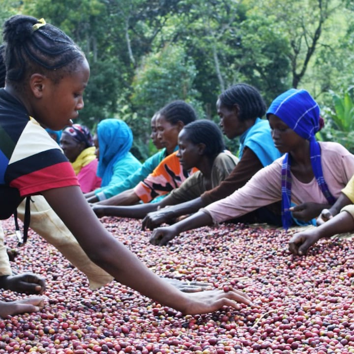 エチオピアのカッファ地域にあるガニチ農園では、無農薬栽培で、熱帯雨林を守る活動をしながらコーヒー栽培を行い、生産方式としては、フォレストコーヒーに分類され森林の多様性を重視しています。また、赤い完熟した実だけを手摘みで収穫し、天日乾燥にて、10~20日間かけて乾燥させます。